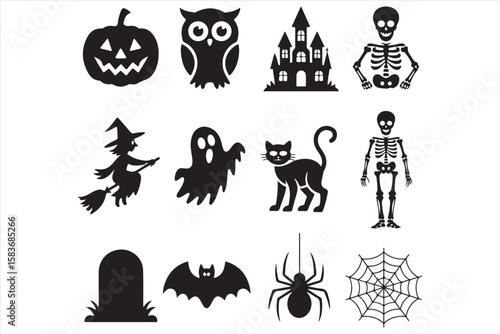 halloween, skittish, pumpkin, owl, skeleton, sorcerer, ghost, black cat, gravestone, bat, spider, spider's web, trick or treat, black-and-white