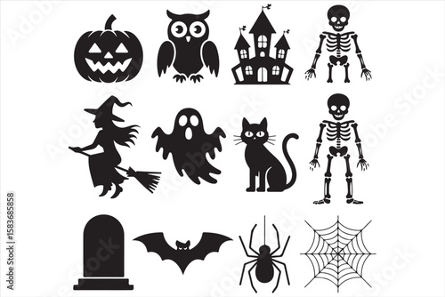 halloween, skittish, pumpkin, owl, skeleton, sorcerer, ghost, black cat, gravestone, bat, spider, spider's web, trick or treat, black-and-white