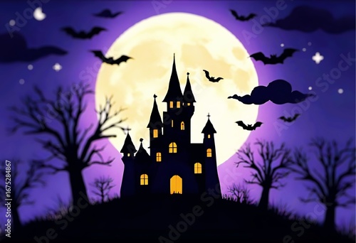 halloween, background, purple, full moon, night, moon, house, castle, haunted, bat, holiday, scarey, horror, tree, vector, silhouette, autumn, illustration, dark, skittish, bat, pumpkin, october, cartoon, black, party, celebration, evil, ghost, sky, decoration, image, template, creepy, seasonal, violet, vibrant