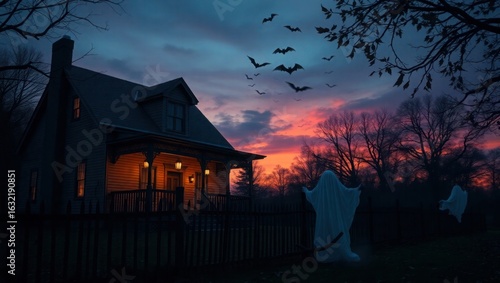 Spooky haunted house with ghosts and bats at twilight sunset