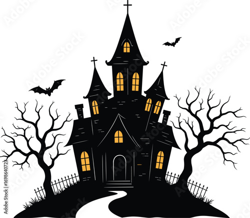 Spooky haunted house with glowing windows, eerie bats flying, creepy dead trees, dark night, Halloween theme, scary atmosphere illustration