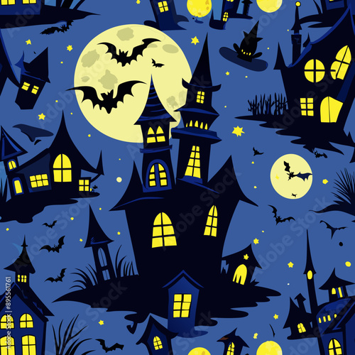 bat, seamless pattern, full moon, skittish, eerie, horror, dark blue, halloween, moon, house, night, castle, haunted, bat, holiday, vector, autumn, pumpkin, silhouette, scarey, cartoon, illustration, dark, tree, party, october, black, evil, cat