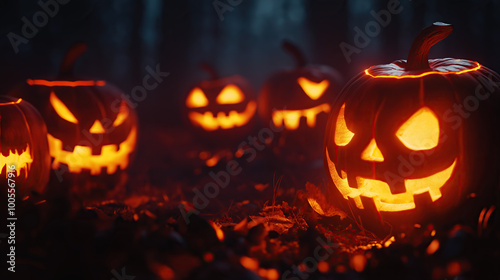 Spooky Jack-o-Lanterns at Night Multiple carved pumpkins glowing in the dark with spooky or fun designs