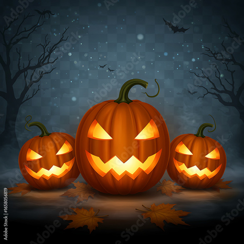 Spooky Jack-o'-lanterns glow with eerie light on a mysterious Halloween night with bats flying