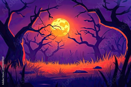 halloween, skittish, moonlit, forest, dead, tree, vibrant, colours, eerie, night, dark, scarey, gothic, autumn, nature, illustration, fantasy, silhouette, creepy, imagination, mystery, orange, yellow, purple, pink, graphic, background, digital, artwork, landscape, design, vector, art, moon, glowing, grass