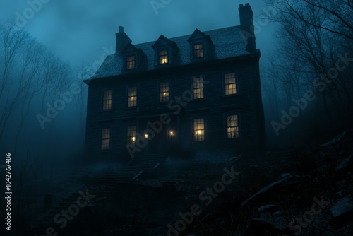 Spooky old haunted house: Eerie house surrounded by mysterious fog at night. Halloween, horror, fairytale background concept.
