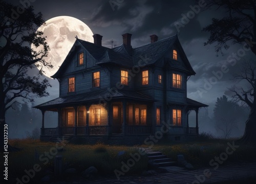 Spooky old house with glowing windows under full moon, glowing windows, haunted mansion