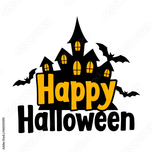 Spooky Season Greetings, Happy Halloween with Haunted House Silhouette and Bats Against a Transparent Background for Celebration