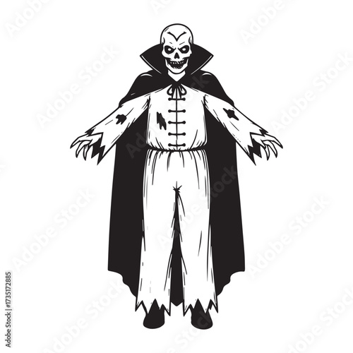 skeleton, man, costume, halloween, skittish, scarey, creepy, death, monster, vampire, ghost, horror, dark, black-and-white, illustration, drawing, character, figure, full body, standing, open arms, tattered, ripped, ragged, supernatural, evil, night, celebration, holiday