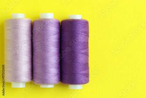 Spools of colorful sewing threads on yellow background, flat lay. Space for text