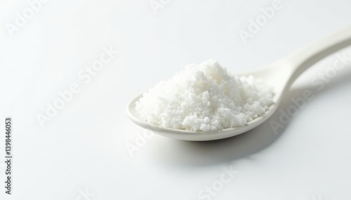 Spoonful of white sugar against white backdrop, macro photography, macro