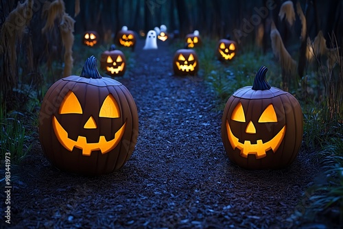 Spoopy haunted forest, with friendly ghosts and glowing jack-o’-lanterns lighting the path