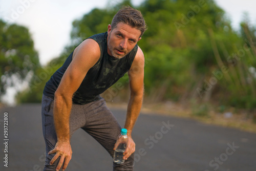 sport and fitness lifestyle portrait of young attractive sweaty and tired man exhausted after outdoors running workout on beautiful country road breathing