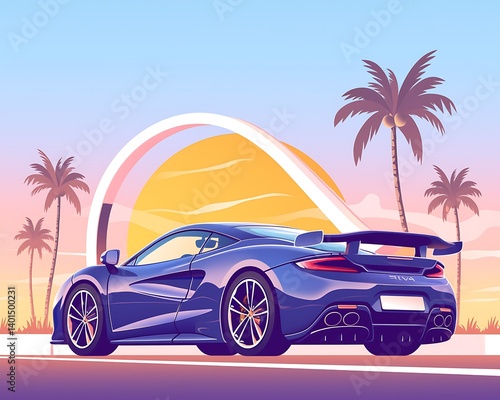 car, sport, sunset, beach, palm, tree, road, luxury, vehicle, speed, drive, design, illustration, graphic, art, modern, fast, powerful, automobile, purple, blue, summer, vacation, travel, racing, exotic, performance, concept, view, exterior, detail, background, horizon, aesthetic, digital, beautiful, smooth, stylish, coupe, rendering, pastel