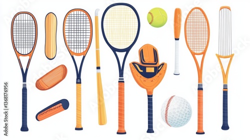 Sport equipments set. Tennis rackets, Golf clubs, Baseball bats, Lacrosse sticks, Hockey cues, Cricket bats. Sport icons for logo, label, poster, emblem template. Vector illustration