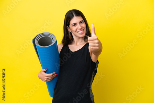sport Italian woman going to yoga classes isolated on yellow background with thumbs up because something good has happened