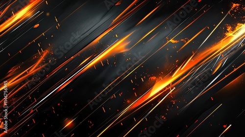 sports background with geometric lines and diagonal stripes, dominant black backdrop, vibrant orange lightning streaks, futuristic and high-energy atmosphere, modern sports design
