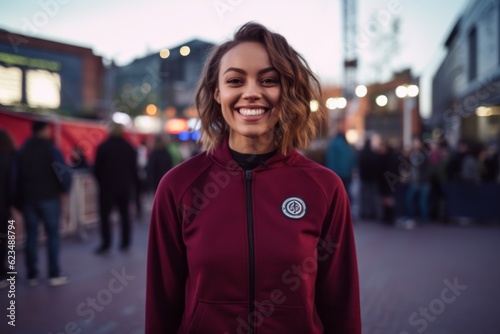 Sports portrait photography of a happy girl in her 30s wearing a comfortable tracksuit against a lively concert venue background. With generative AI technology