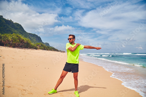 Sportsman stretching on a exotic tropical beach after jogging / exercising.