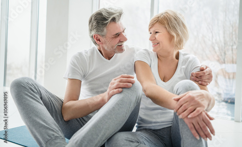 Sporty senior couple sitting on the mat in the white fitness gym looking each other and talking. Sports and healthy lifestyle.