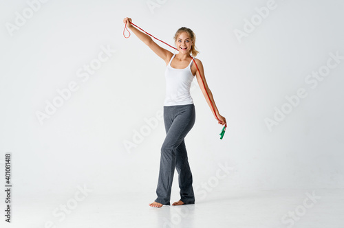 sporty woman with skipping rope and in gray fitness pants