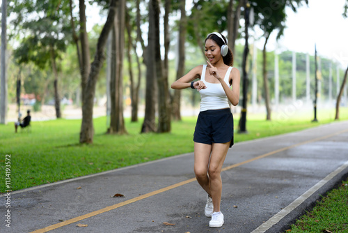 Sporty young woman checking her fitness progress on her smartwatch while jogging in a park