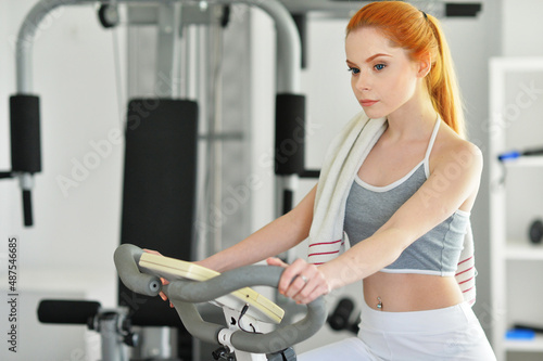 Sporty young woman cycling in gym