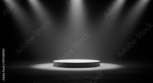spotlight stage, empty podium, black background, dramatic lighting, circular platform, minimalist design, high contrast, theatrical atmosphere, 3D rendering, cinematic, anticipation, showcase, perform