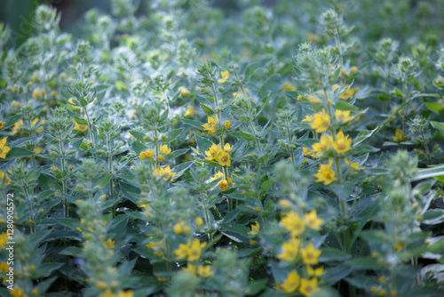 Spotted Loosestrife. Lysimachia punctata, the dotted loosestrife. Buds. Yellow flower. Flowers bells of large yellow loosestrife or circle flower or spotted loosestrife with selective focus