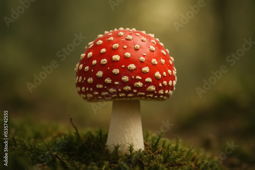 Spotted red fly agaric mushroom with white stem growing on lush mossy forest floor in soft natural morning light