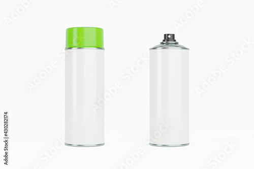Spray paint can with green cap and white label. Isolated on white background for mock-up, branding.