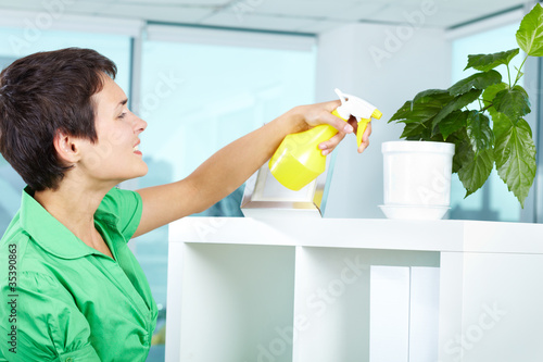 people, woman, female, girl, lady, white, job, adult, young, pretty, person, brunette, 1, charming, feminine, caucasian, fashion, green, casual attire, beautiful, lovely, single, holding, housework, chore, homemaker, housekeeper, housekeeping, labor, shelf, wearing, maid, home, clean, work, household, spray, spraying, watering, plant, leaf, flower, domestic, biology, botany, growth, growing, botanical, floral, florist