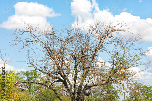Spreading withered tree against the blue sky and spring greenery.