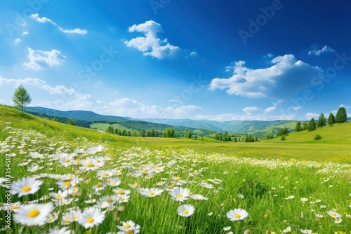landscape, nature, grass, sky, spring, summer, field, blue, flower, daisy, plant, wildflower, panoramic, scenery, cloud, tree, background, outdoors, green, photo, hill, pastoral, countryside, beautiful, blowball, land, blooming, agriculture, springtime, sunlight, blossom, cosmos, growth, meadow, image, inflorescence, calmness, asteraceae, landscaped, fragility, freshness, closeup, rapeseed, idylli