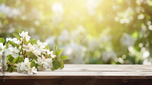 Spring background with white blossoms and white wooden table flooring. Banner with copy space