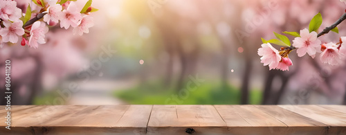Spring beautiful background with sakura with an empty wooden table on nature outdoors in sunlight in garden.