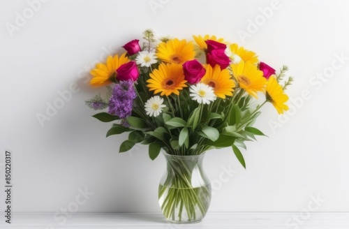 Spring bouquet of yellow gerberas and red roses in vase on a white background