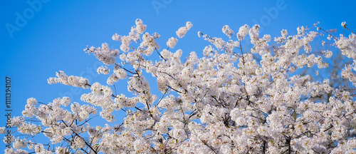 Spring day. Spring nature. Branches of blossoming cherry with soft focus on light blue sky background in sunlight. Beautiful floral image of spring nature. White flowers the fruit tree.