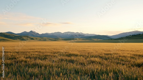 Spring Equinox day concept. Peaceful Golden Sunlight over a Scenic Countryside Meadow with Mountains in the Background