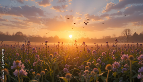 sunrise, nature, flower, fresh, renewal, peaceful, seasonal change, blossom, outdoors, golden light, balance, growth, awakening, tranquil