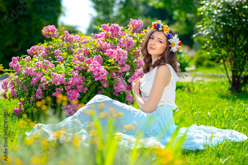 Spring fairy goddess fantasy woman enjoys the sunny day sitting near blooming pink roses. Outdoor close up portrait of young beautiful happy smiling lady. Youth, romantic and lifestyle concept