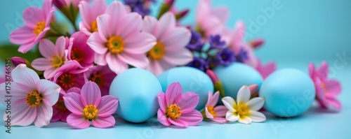 Spring floral arrangement with pastel blue Easter eggs, celebration, artistic