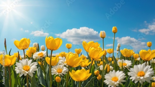 spring, background, yellow, tulip, daisy, flower, design, copy space, text, floral, nature, vibrant, colourful, beautiful, cheerful, happy, fresh, blooming, blossom, garden, meadow, field, spring flower, floral pattern, design element, graphic design, banner, poster, invitation, card, wallpaper, springtime, yellow tulip, greengrass, blue skies, soft focus, blurred background, bokeh