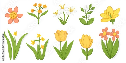 spring, flower, illustration, pastel, colours, yellow, white, orange, pink, tulip, daffodil, narcissus, leaf, stem, blossom, floral, design, nature, springtime, botanical, decorative, simple, cute, vibrant, element, pattern, graphic, artwork, beauty