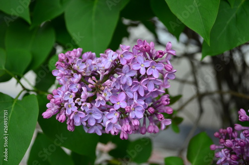 spring flowers, a lilac branch with flowers and buds on a background of green foliage
