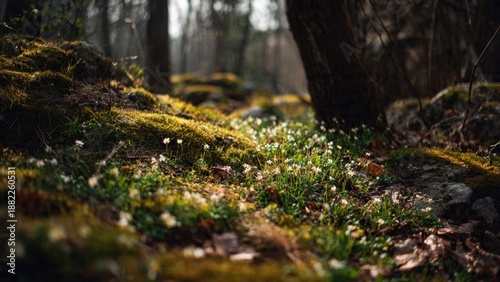 forest, spring, flower, nature, moss, ground, white flower, green, sunlight, timberland, flora, environment, peaceful, tranquil, serene, scene, forest floor, springtime, bloom, blooming, lush, outdoors, seasonal, growth, wildflower, natural, calm, light, foliage, plant, vegetation, underbrush