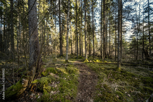 spring forest with green moss and sunshine rays
