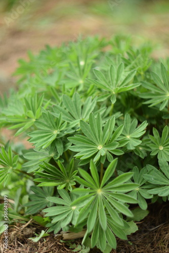 Spring fresh green leaf of lupine (Lupinus polyphyllus) by manual helios lens, swirly bokeh.