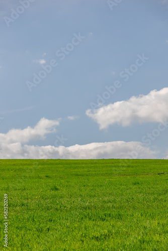 grass, sky, field, landscape, green, meadow, blue, nature, summer, cloud, cloud, spring, horizon, agriculture, sun, country, farm, hill, rural, white, countryside, land, clear, season, environment