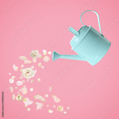 Spring is coming. Turquoise watering can, beautiful flowers and petals on pink background